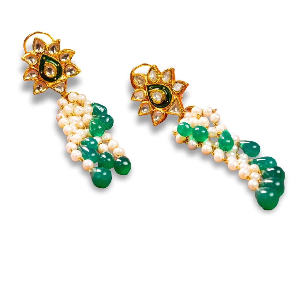 Make an elegant statement with these stunning Emerald Waterfall Drops, beautifully crafted in 18kt gold. Featuring cascading green stones and delicate pearls, these earrings capture the essence of flowing grace and timeless beauty. Perfect for festive occasions and celebrations, they add a touch of sophistication and charm to any traditional or contemporary outfit.