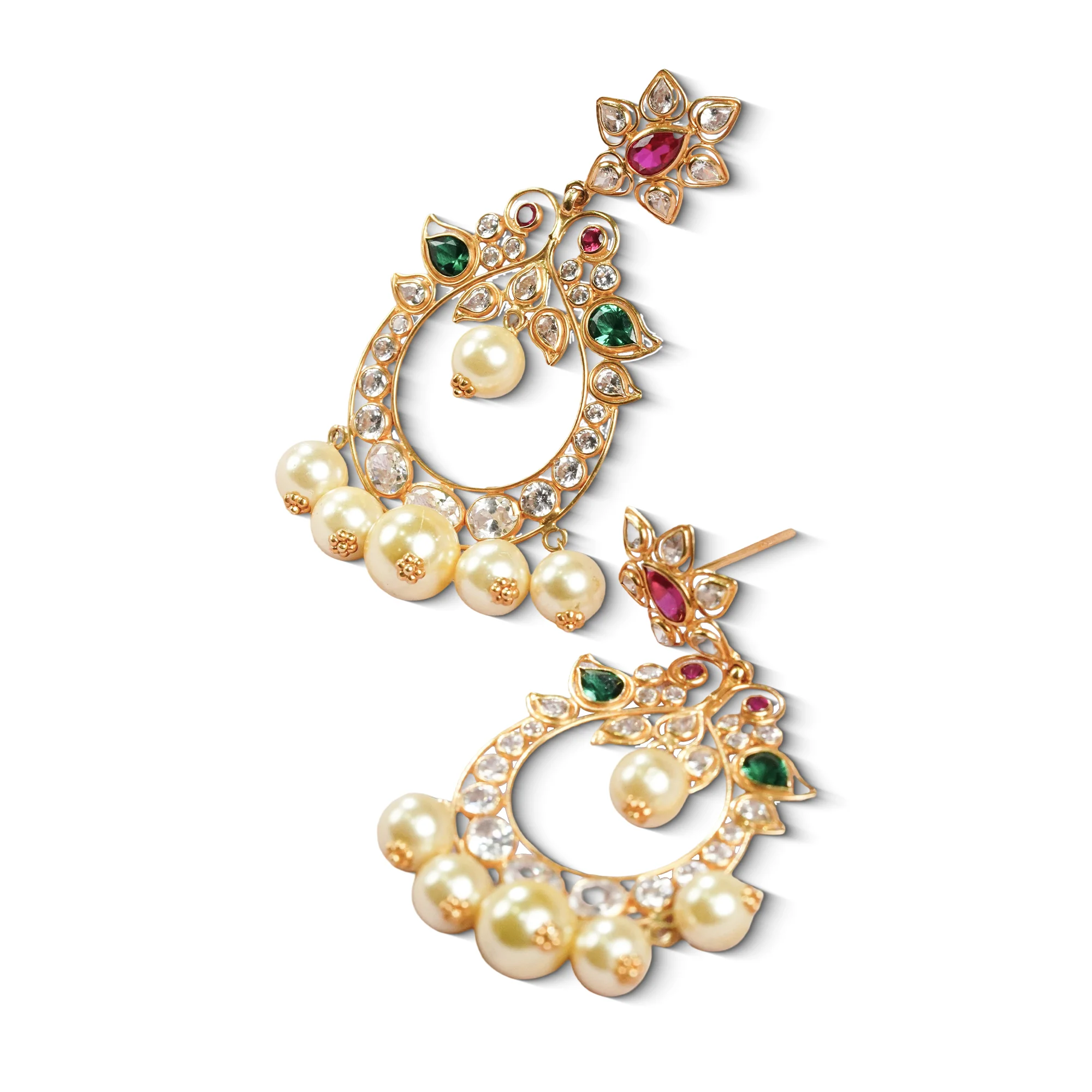 Elevate your festive look with this exquisite Pearl Floral Hoop Jhumka, crafted in a luxurious 18kt gold finish. Adorned with red and green stones, pearls, and shimmering AD stones, this jhumka beautifully blends tradition with elegance. Its floral hoop design adds a regal charm, making it a perfect choice for festive occasions, religious ceremonies, or traditional gatherings. Pair it with ethnic attire to complete your timeless look.