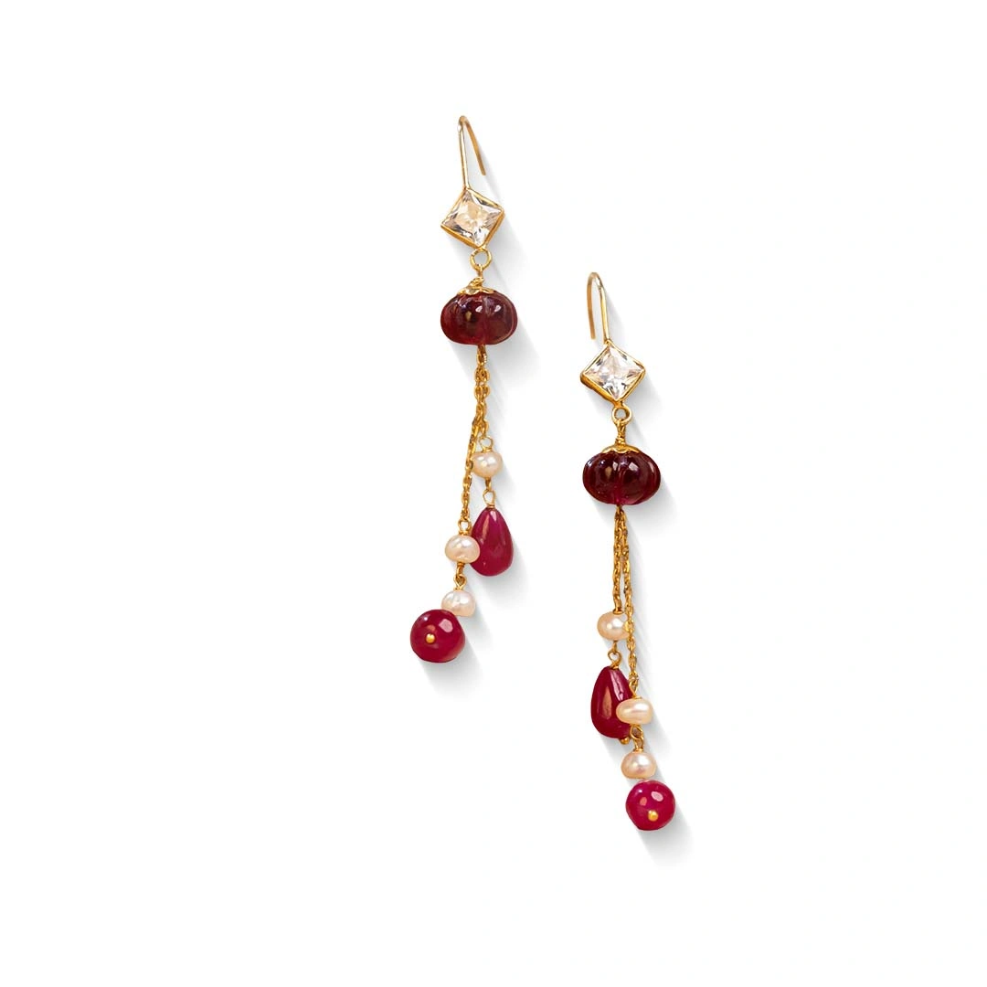 Add a touch of vintage charm with these elegant Victorian Style Chain Drops, beautifully crafted in 14kt gold. Adorned with rich red stones, delicate Kundan accents, and lustrous pearls, these earrings reflect timeless sophistication with a modern twist. Perfect for casual and semi-festive wear, they bring effortless grace and subtle luxury to your everyday style.