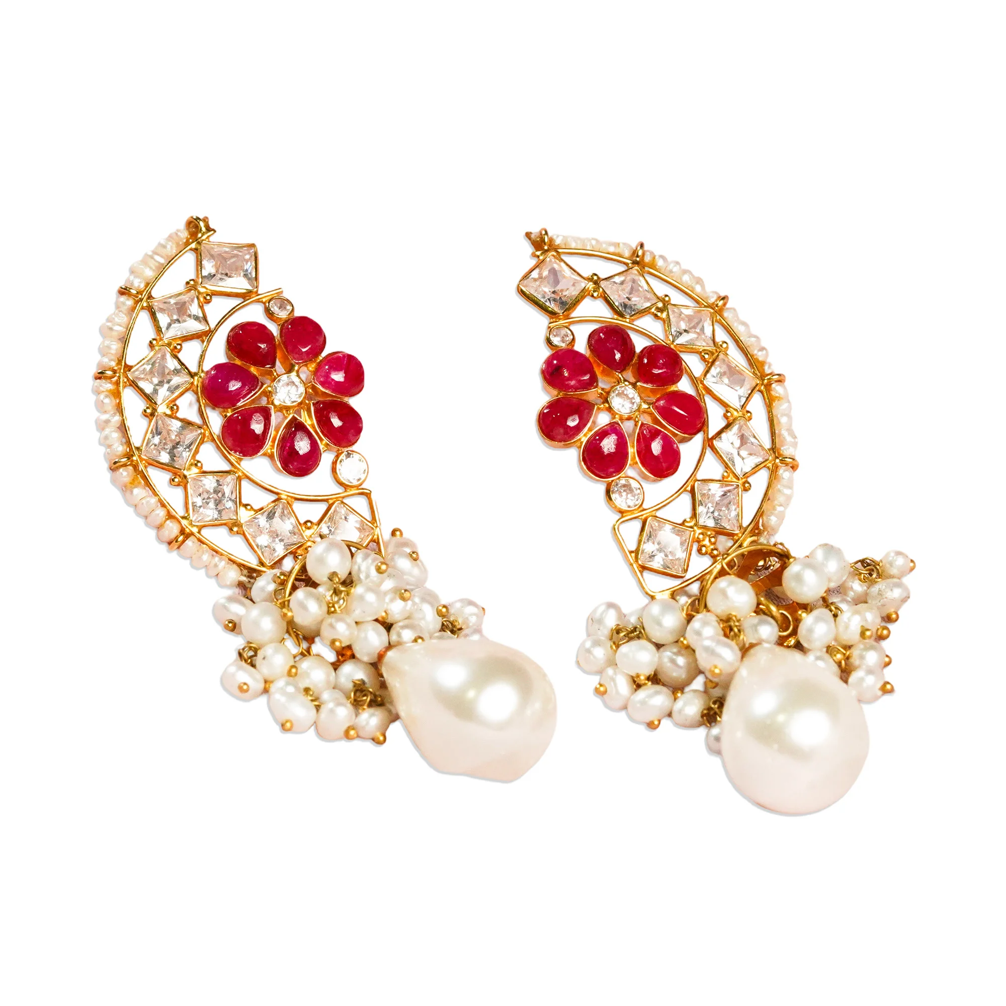 Radiate festive elegance with these stunning Ruby Kundan Danglers with Pearl Drop, beautifully crafted in an opulent 18kt gold finish. Embellished with vibrant red stones, intricate Kundan work, and a graceful pearl drop, these earrings capture the essence of traditional charm with a touch of sophistication. Perfect for festive celebrations, weddings, and special occasions, they add timeless allure to any ethnic ensemble.